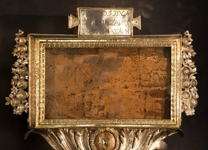 In conclusion, the relic is surely either a forgery or a copy made around 1000 AD. If it was sealed up in the wall of a church then it suggests that it was valued by those holding it at the time, as you would be less likely to make such an effort for a forgery, though I have not seen the evidence surrounding its discovery. The backwards writing is indeed a mystery and not the kind that deepens your faith, just puzzling. I don't trust it, but it gives a way of contemplating the crucifixion and the importance of those words, and that is clearly a massive source of spiritual strength for many, many people. If you believe enough to make the pilgrimage just in case it is true, or because you want to offer up a part of your life, your will and your body to Our Lord, then you have faith, and God bless you. Let us dwell on that and on our loving Saviour whom we all crucified under this sign in AD 33 through our sins, and who loves us without measure.