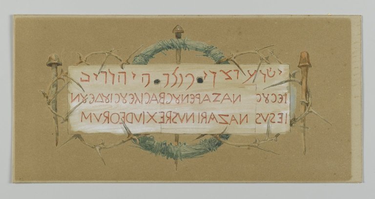 (1) The Greek and Latin words are written right-to-left ('retrograde'). I have nowhere seen any good explanation for this. There are bad ones, such as here "Since the Hebrew language is written right to left, the other two languages are also written in this way" - surely a non sequitur, since each line is surely written for a different audience. In a few situations, apparently, writers would wrap a sentence or flow of text from right-to-left after it had begun left-to-right and reached the end of the substrate so that the eye moves back more easily along the letters (called 'boustrophedon'), but that is not the case here. This commentator is similarly very sceptical, and this book states that retrograde Greek writing in stone was rare until near the end of the 6th century. Another detailed source touches on it but does not speculate as to the likelihood of a first-century inscriber writing retrograde. I can speculate a reason, that the signwriter, having written Hebrew first, wanted to make sure that the Greek and Latin didn't then spill over the right side of the wood, but it surely takes little effort to sketch it out first on your wood before you write anything at all. Tissot suggests the writers of the Title would have been Jewish, which is logical if the Romans struggled to write Hebrew, though I would like to see more evidence to support such an important part of the Roman - pointedly not Jewish - execution process being given to Jews. Jesus had earlier ridden into Jerusalem with thousands of cheering supporters and was very well known and, on the face of it, a serious threat to law and order. The Jews were indignant that those precise words be used and Pilate said 'What I have written, I have written' - so, would he really pay no attention, or allow it to be written backwards? I will be open to a good justification for this issue, but from my own research there is scholarly silence.